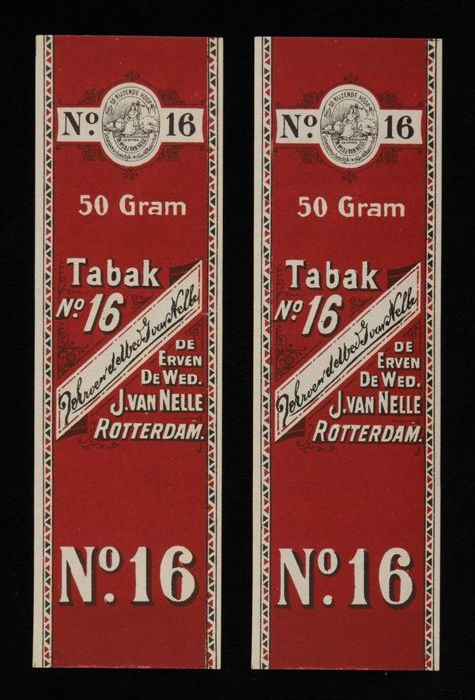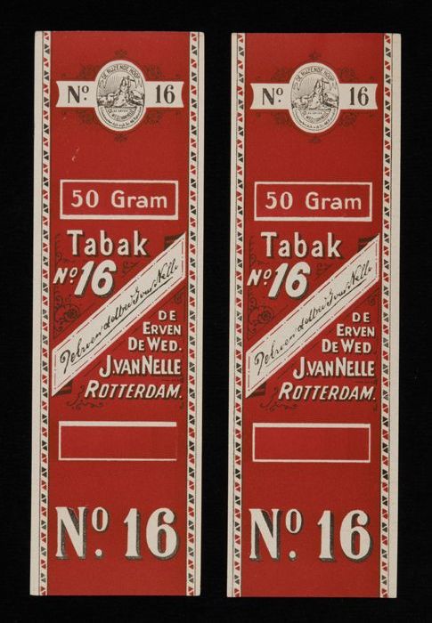 Twee donkerrode labels VAN NELLE TABAK, No. 16, 50 gram