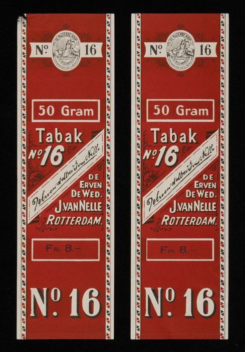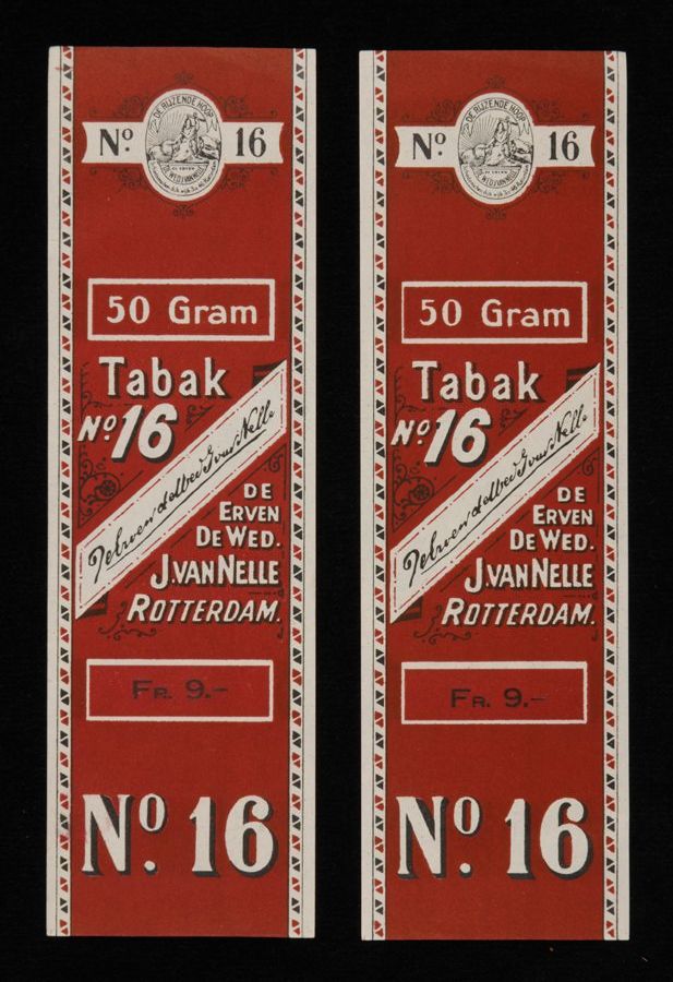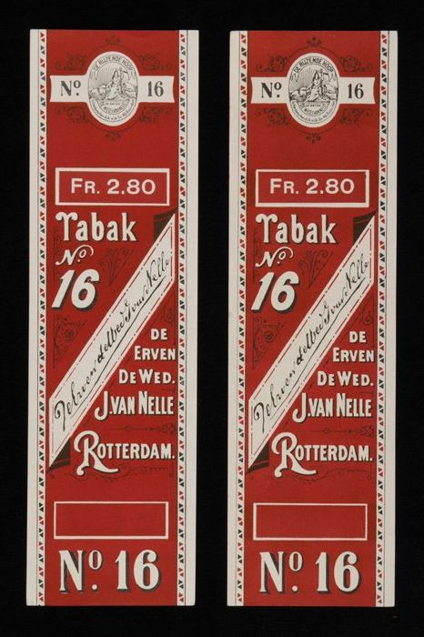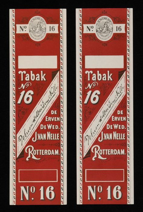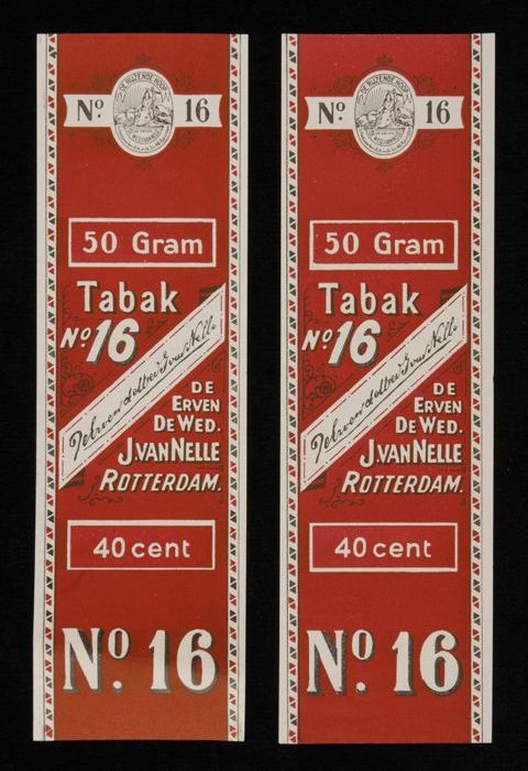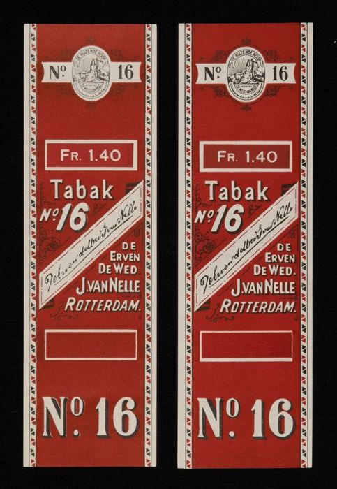 Twee donkerrode labels VAN NELLE TABAK, No. 16, fr. ...