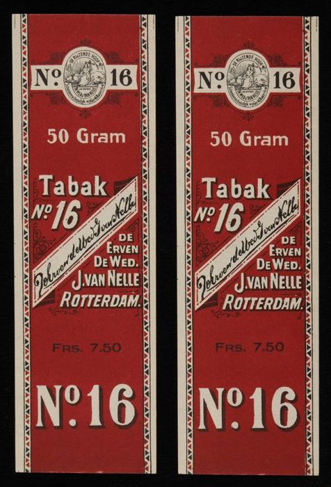 Twee donkerrode labels VAN NELLE TABAK, No. 16, 50 g...