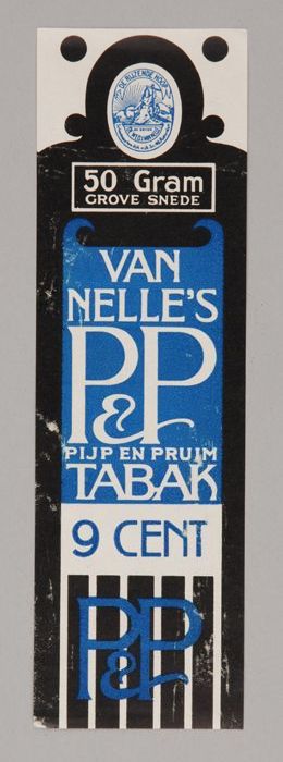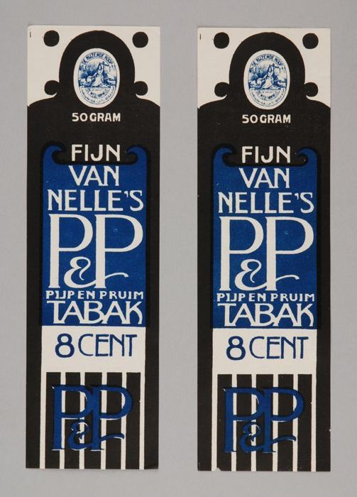 Twee blauwe labels VAN NELLE'S P&P TABAK, 50 gram, 8¢