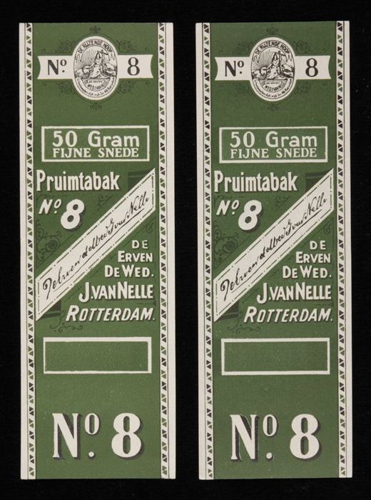 Twee groene labels VAN NELLE PRUIMTABAK, No. 8, 50 g...