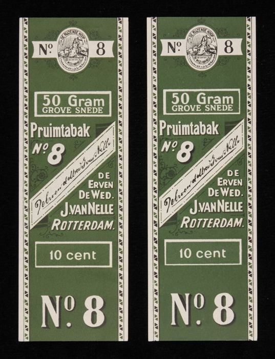 Twee groene labels VAN NELLE PRUIMTABAK, No. 8, 50 gram