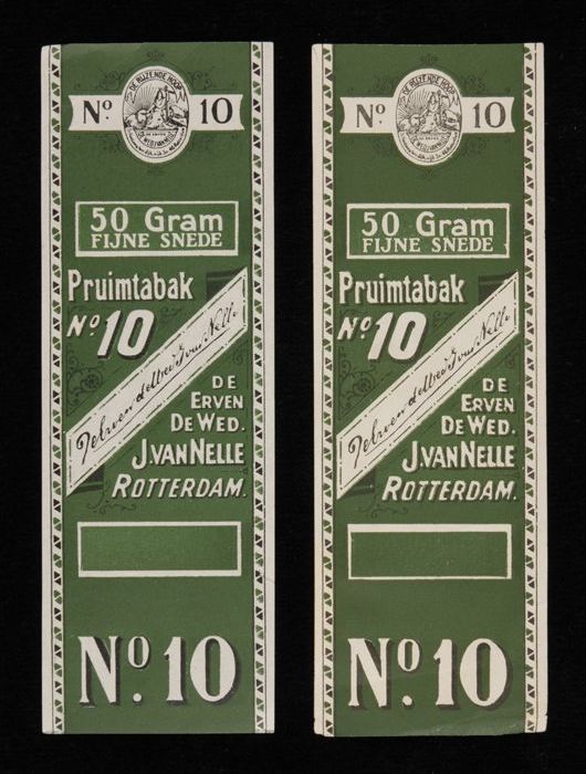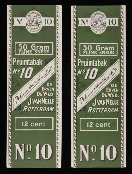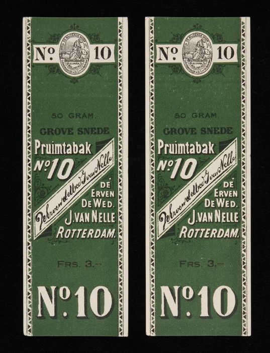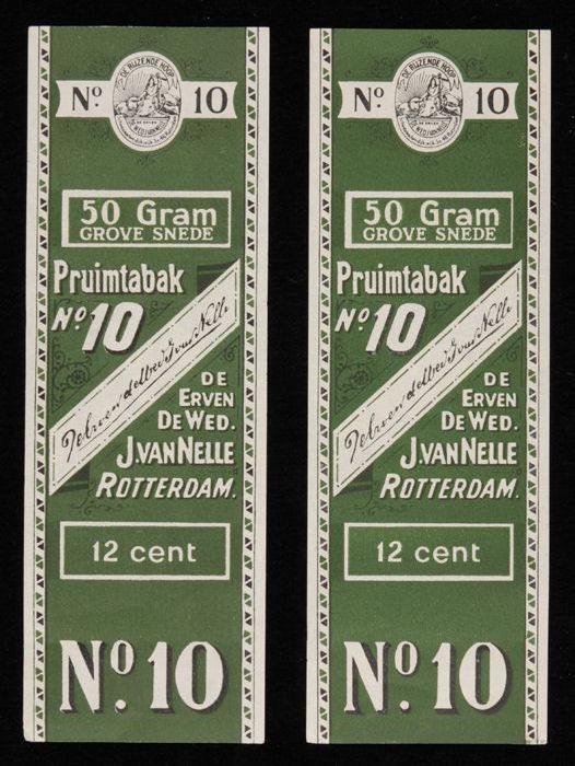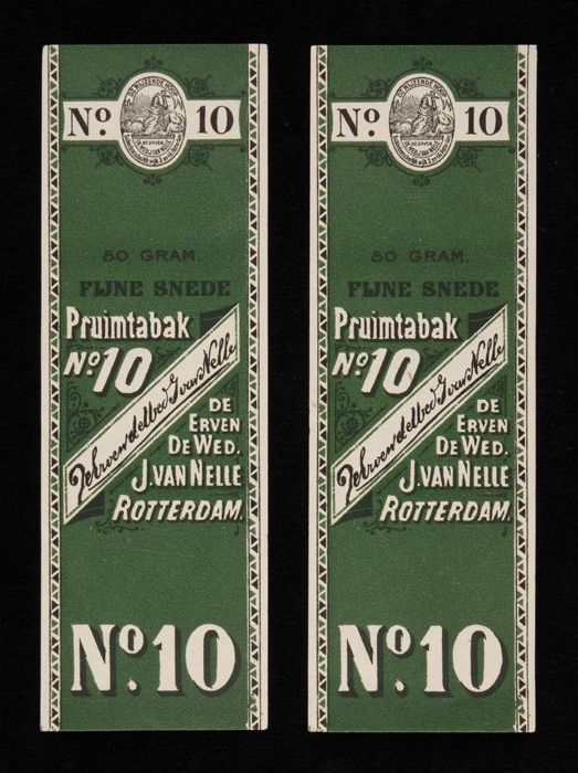 Twee groene labels VAN NELLE PRUIMTABAK, No. 10, 50 ...