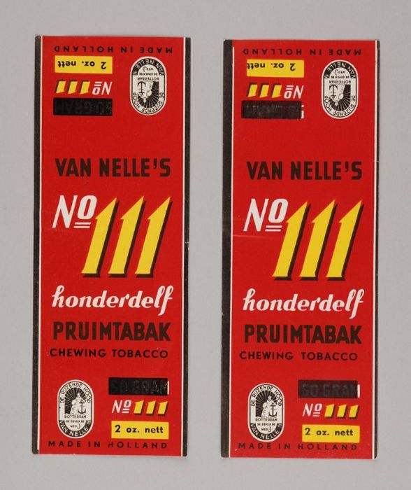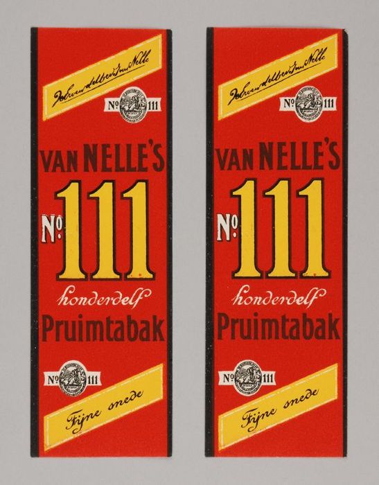 Twee rode labels VAN NELLE'S PRUIMTABAK, No. 111, 56...