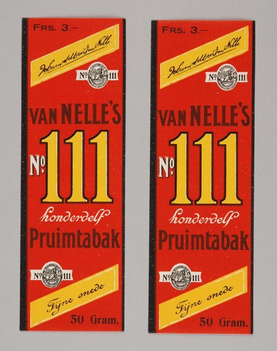 Twee rode labels VAN NELLE'S PRUIMTABAK, No. 111, 50...