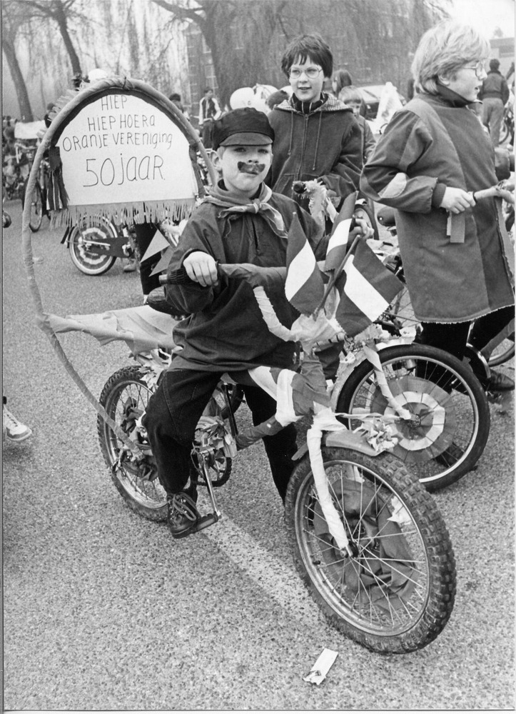 Kinderen met versierde fietsen in de optocht van de ...