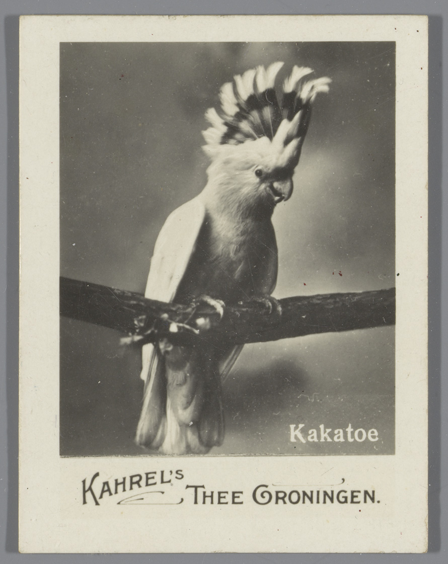 Kaketoe op een stok, reclame voor Kahrel's Thee Gron...
