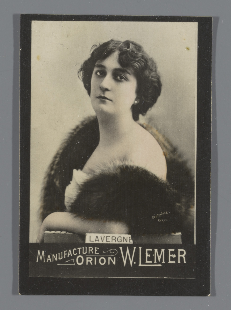 Portret van een vrouw aangeduid als Lavergne, reclam...