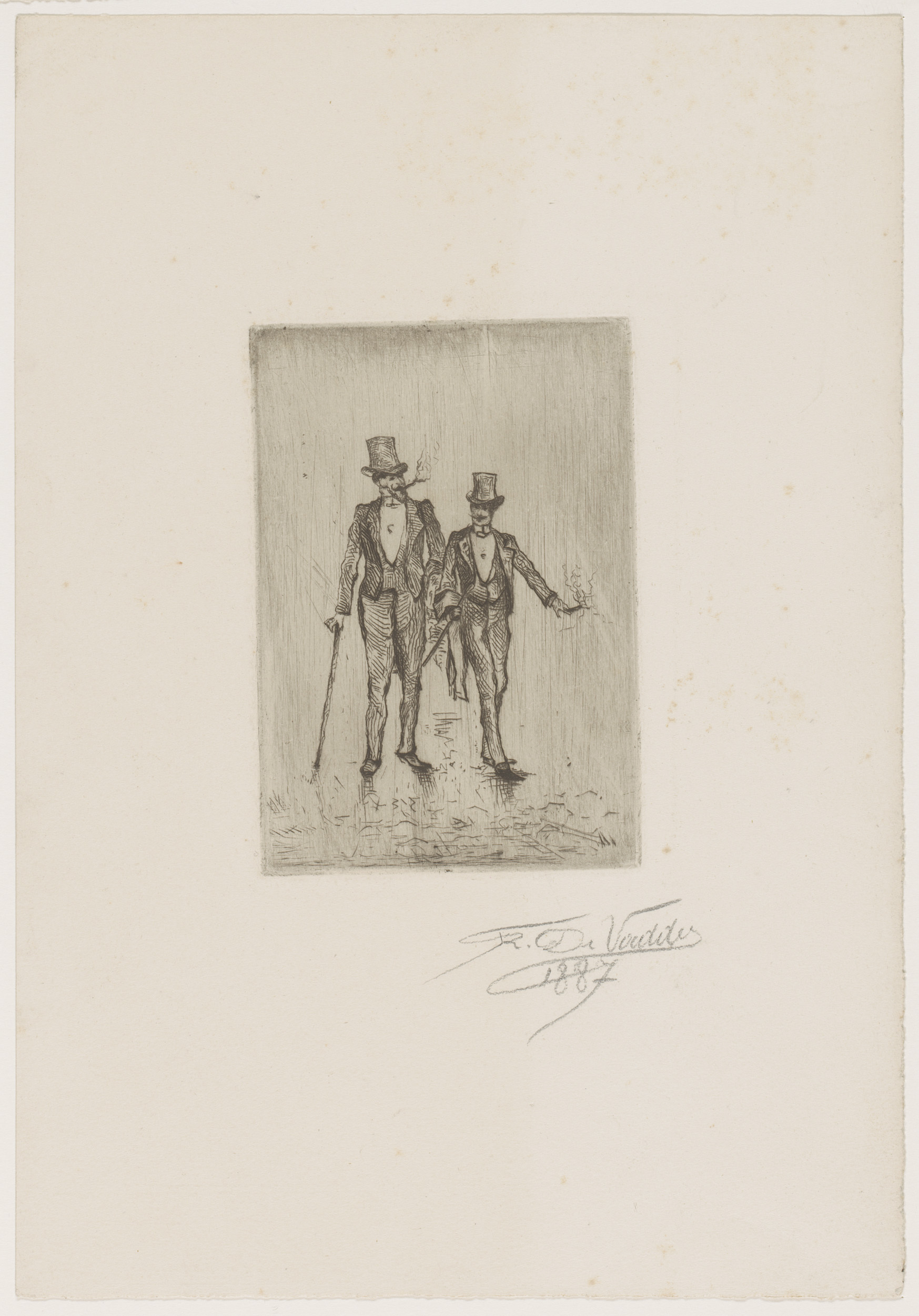 Twee mannen in rokkostuum met wandelstok en sigaar