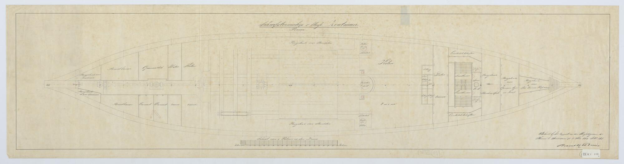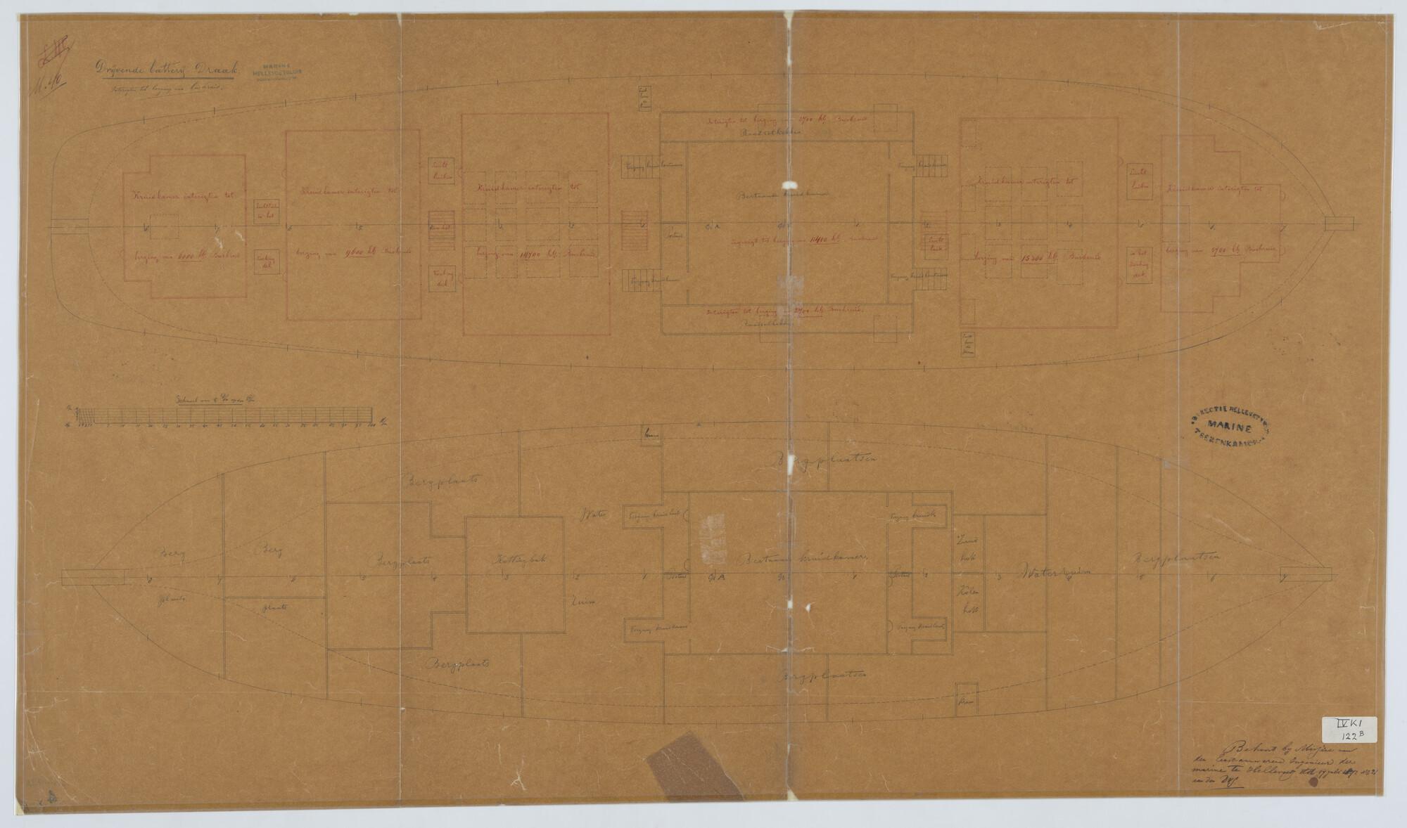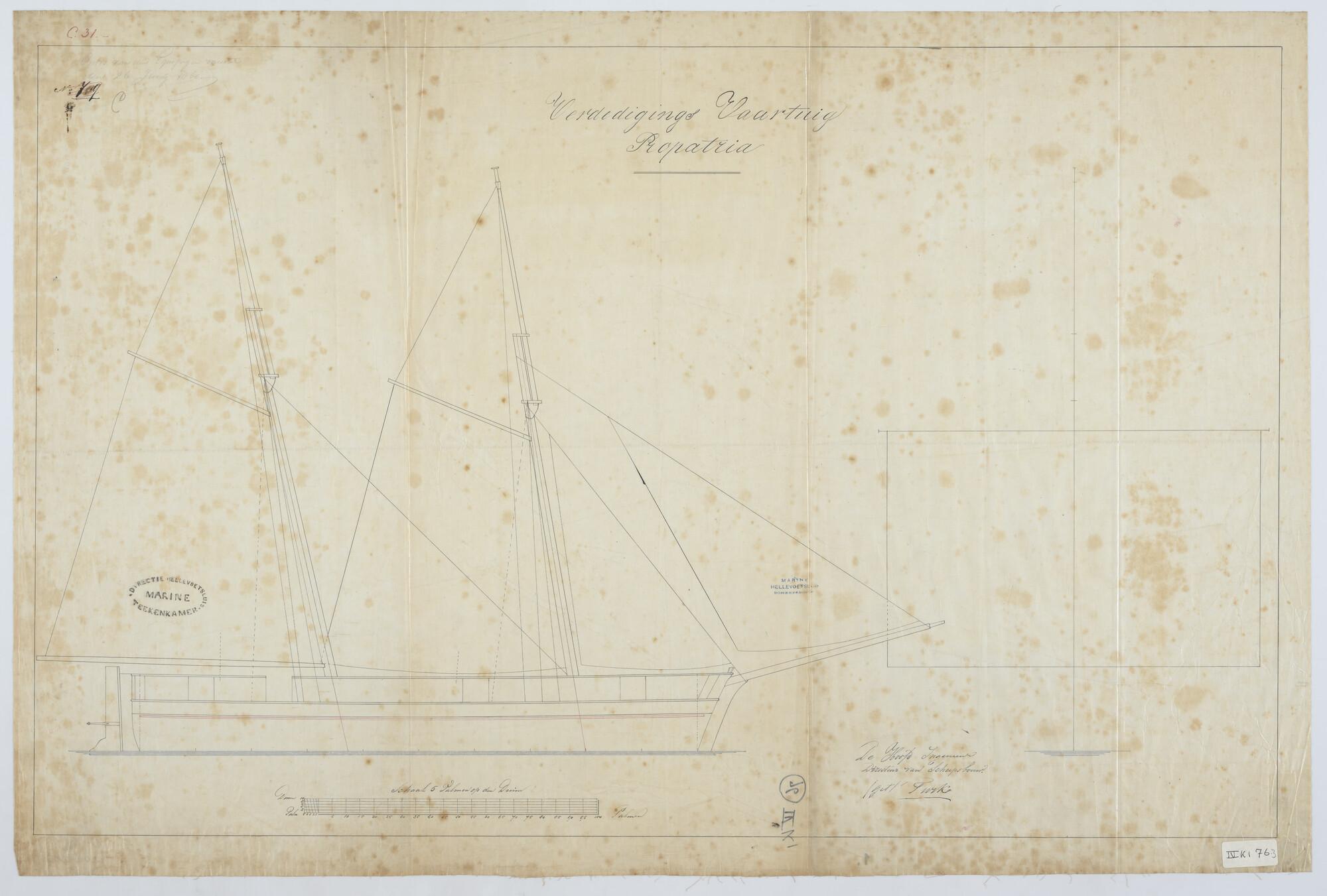 Lijnenplan dekschuit, zij- en bovenaanzicht