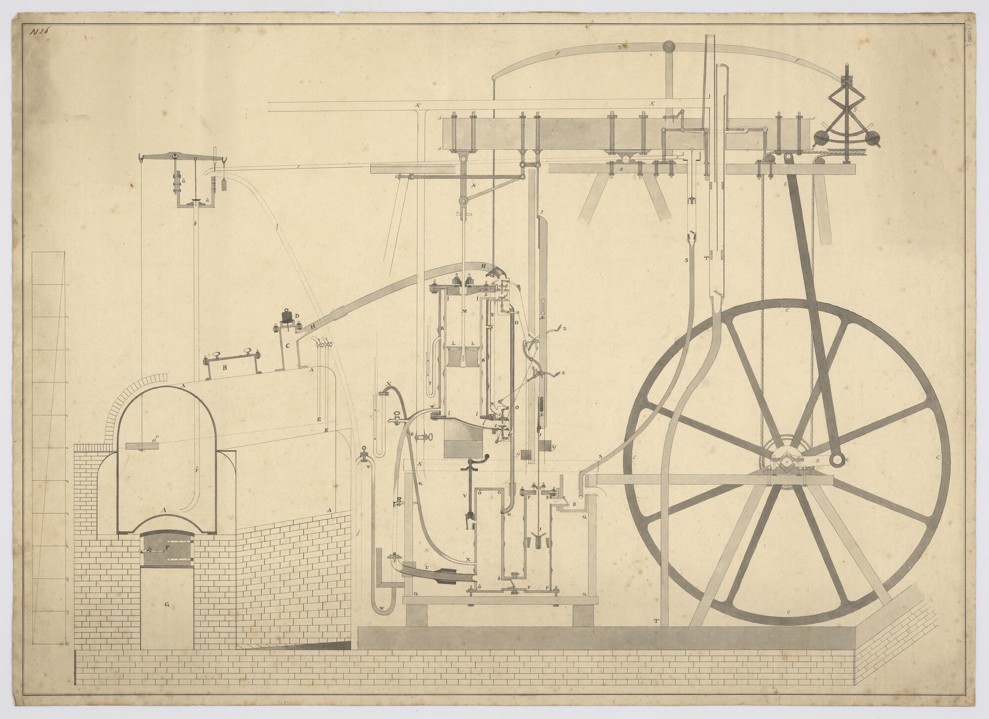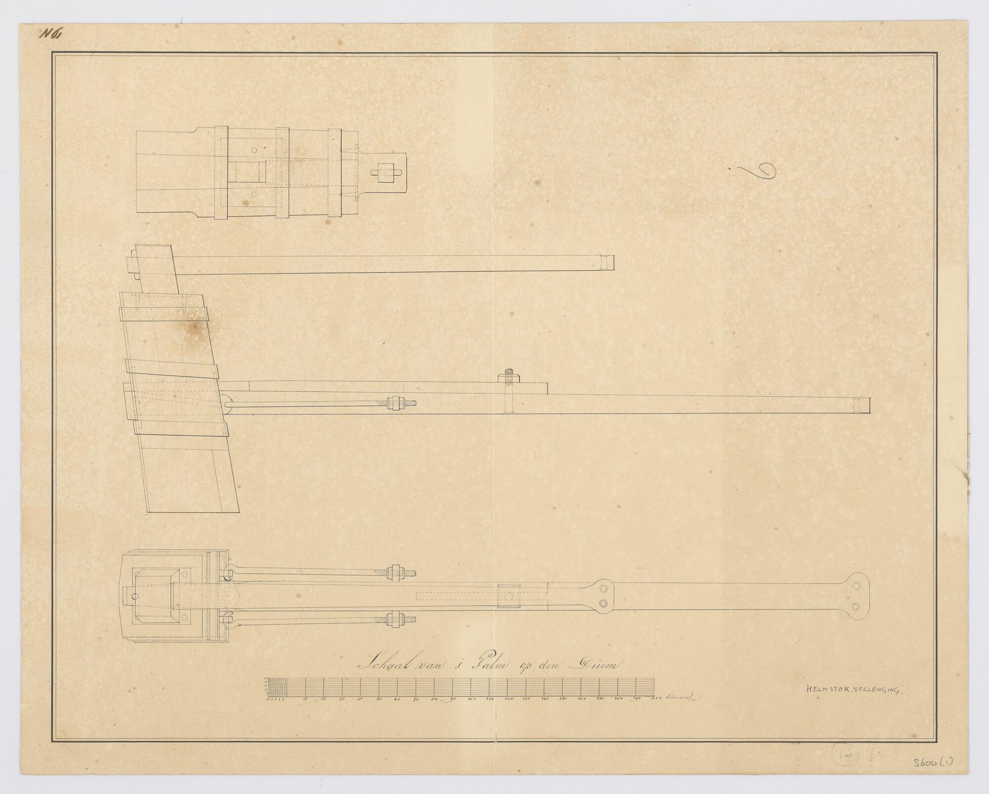 Dwarsdoorsnede en zijaanzicht van stoommotor voor ss...