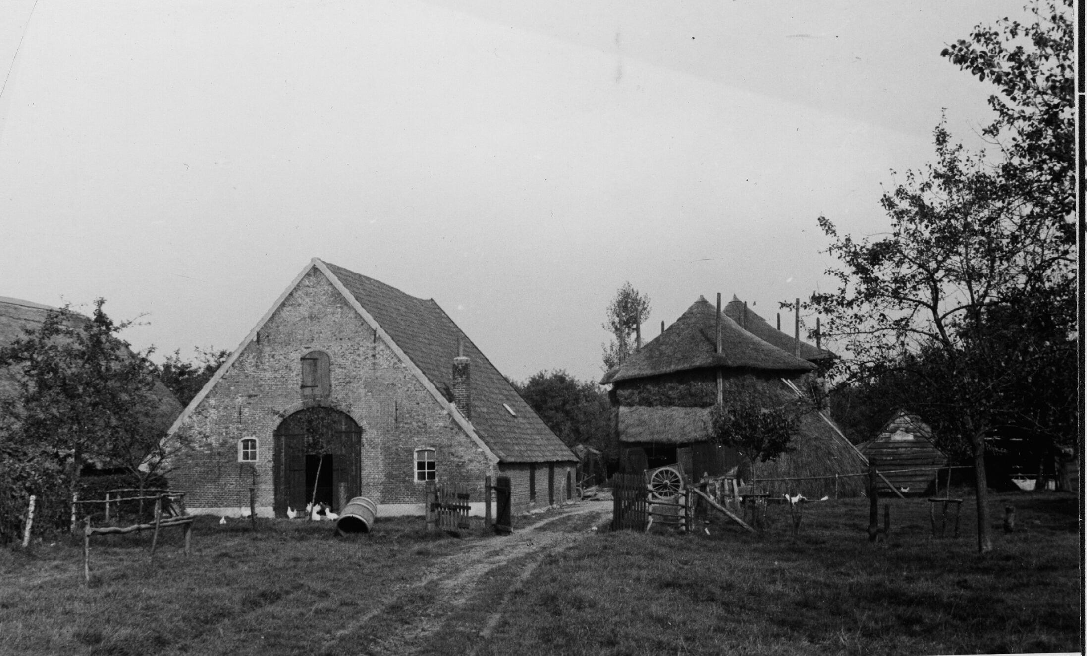 Boerenerf met schuur en hooibergen, Rhenen, 1936 (zw...