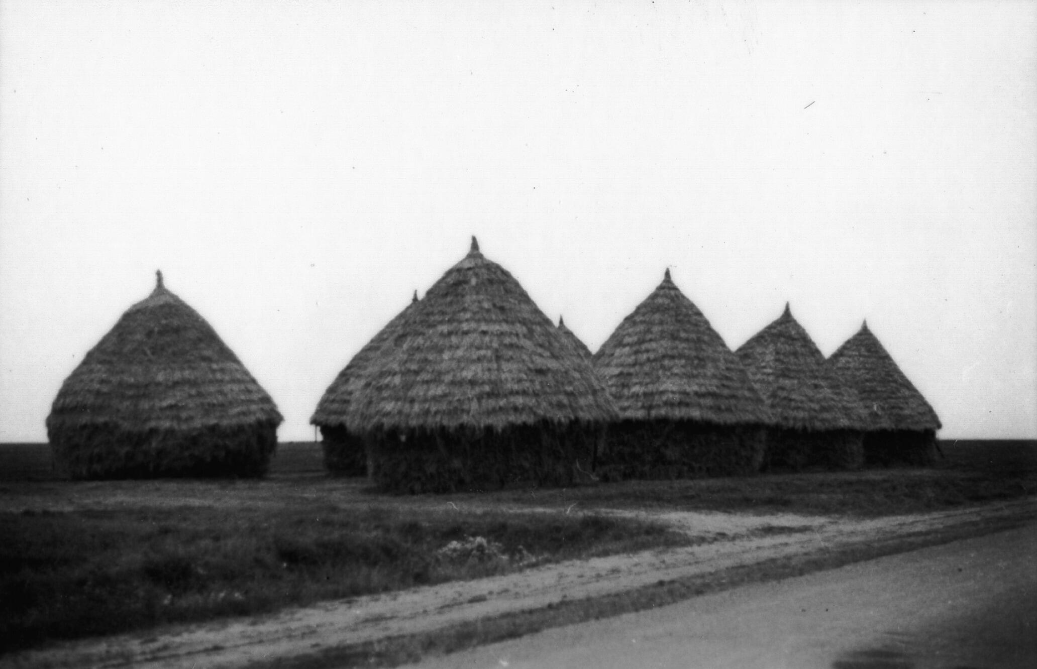 Korenmijten, Wieringermeer, 1936 (zwart-wit foto)
