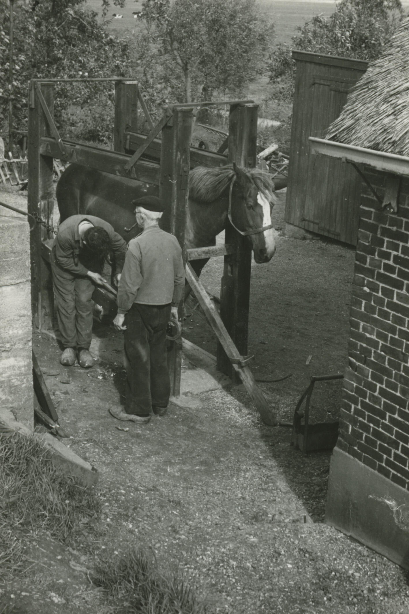 Paard in een hoefstal, Giessen, 1940 (zwart-wit foto)