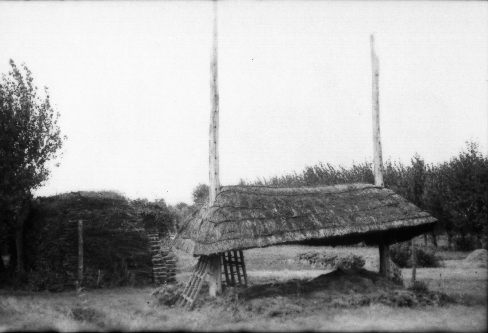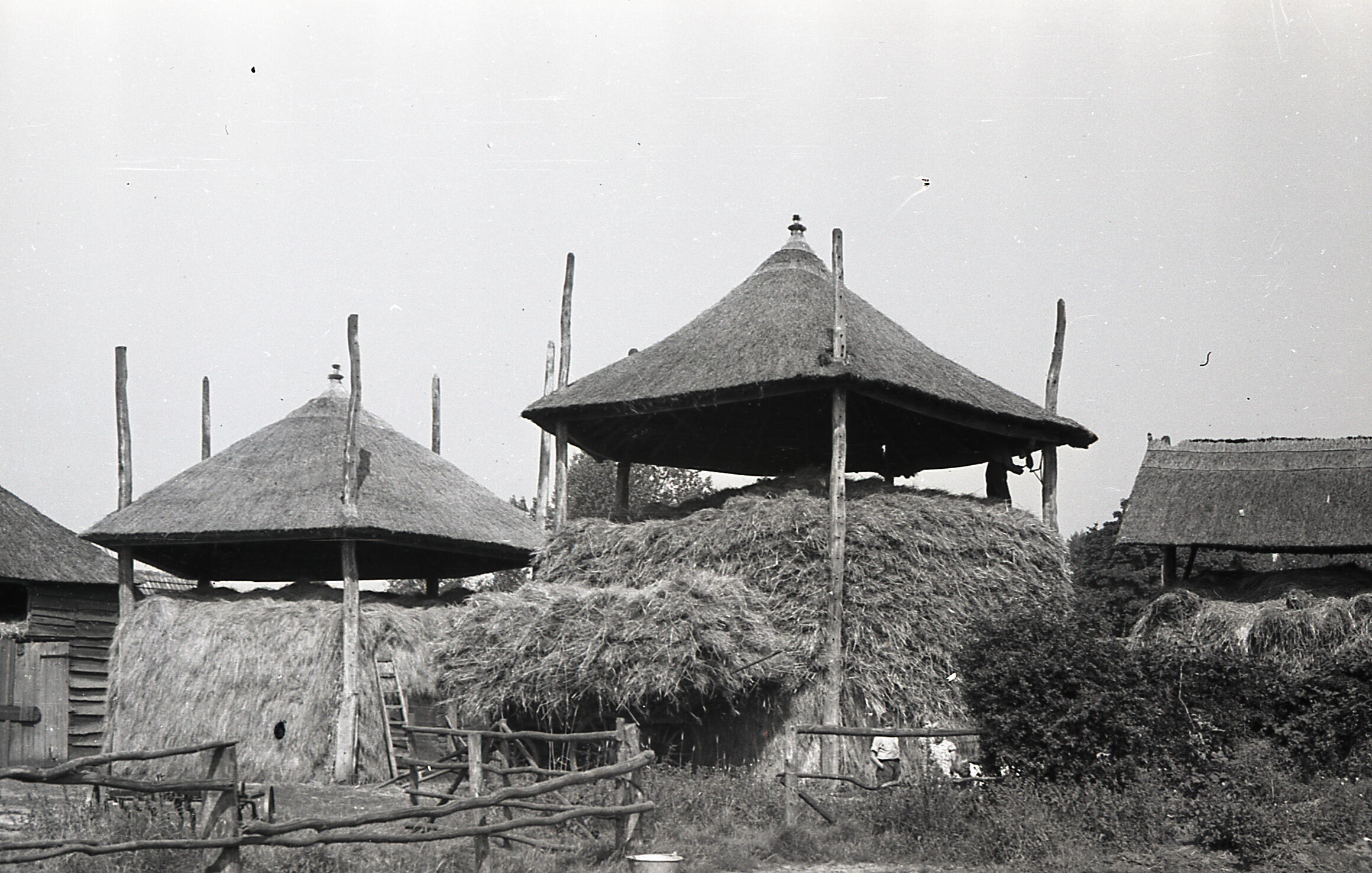 Twee hooibergen, Hoekelum, 1940 (zwart-wit foto)