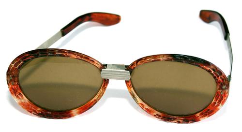 Zonnebril, grote ovalen bruin paarse glazen. Slangen...
