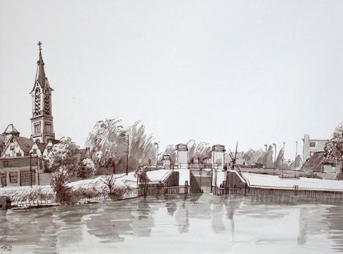 Gewassen pentekening. Delflandse Sluis Vlaardingen m...