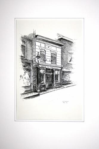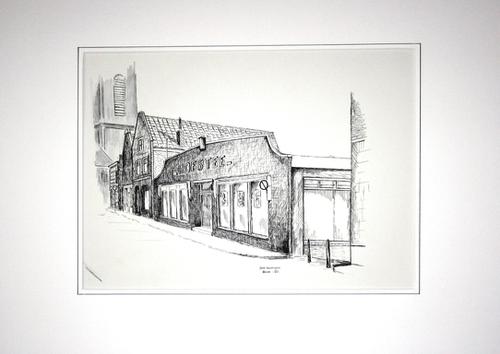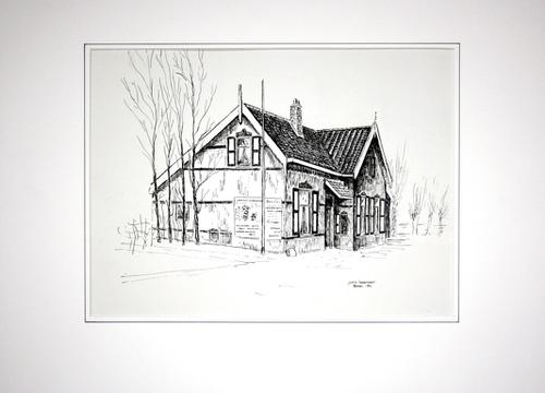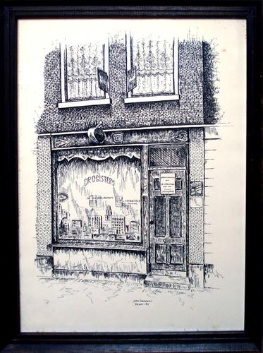 Potloodtekening. Exterieur pand Drogisterij Hennevel...