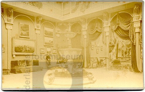 Zaal met fontein in het midden en schilderijen aan d...