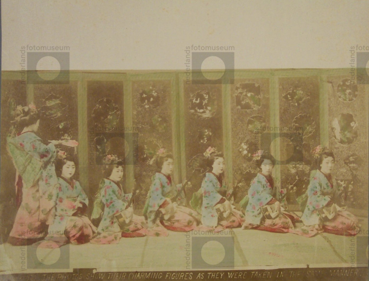 Drie-delige panoramafoto van danseressen, Kyoto, Jap...