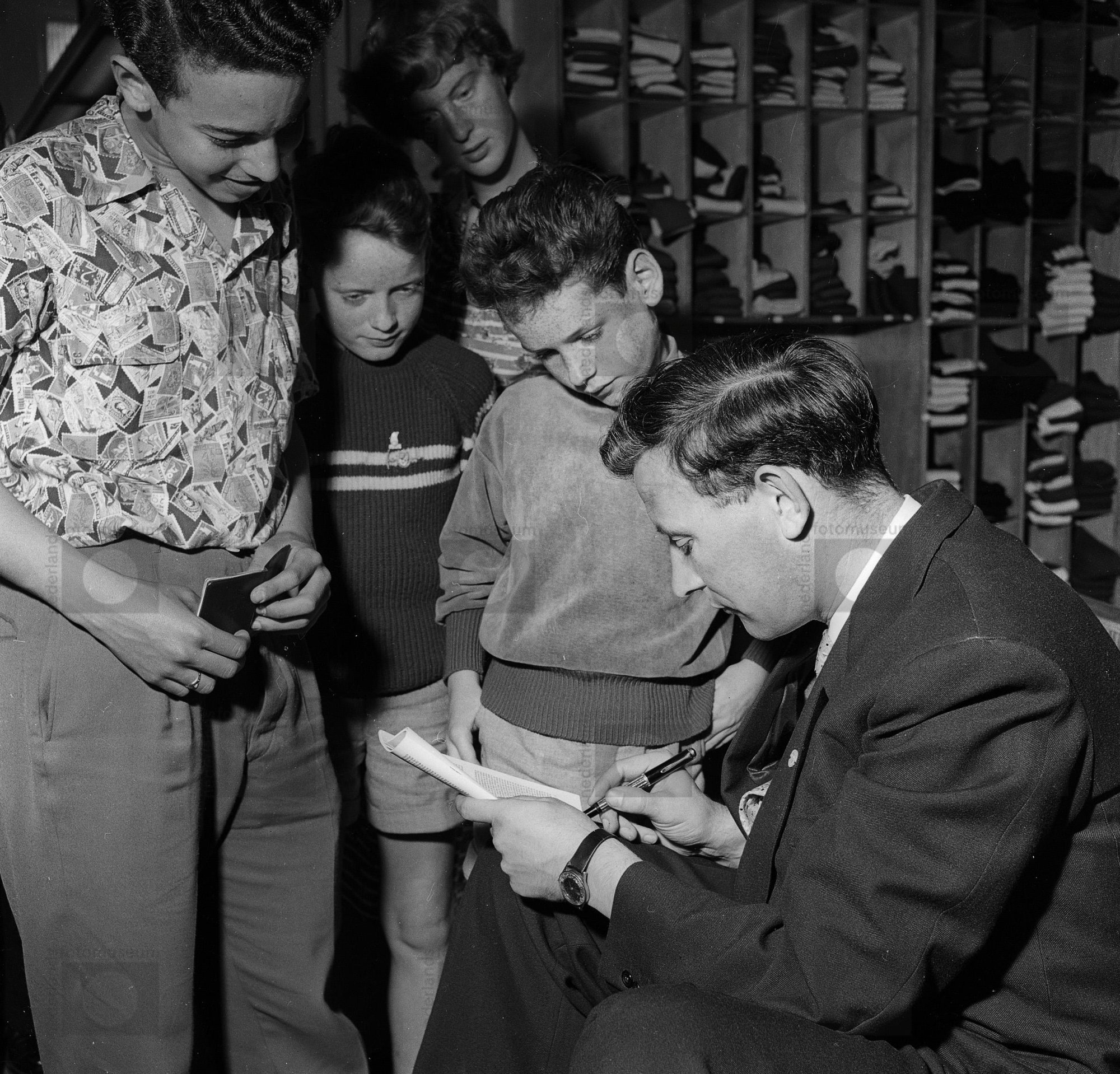 Abe Lenstra met jonge fans in een sportwinkel, Rotte...