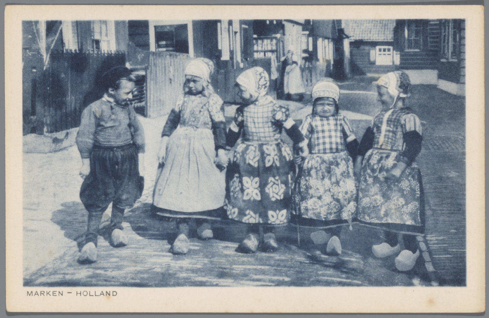 Groep meisjes in Walcherse dracht, spelende een krin...