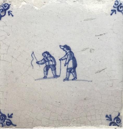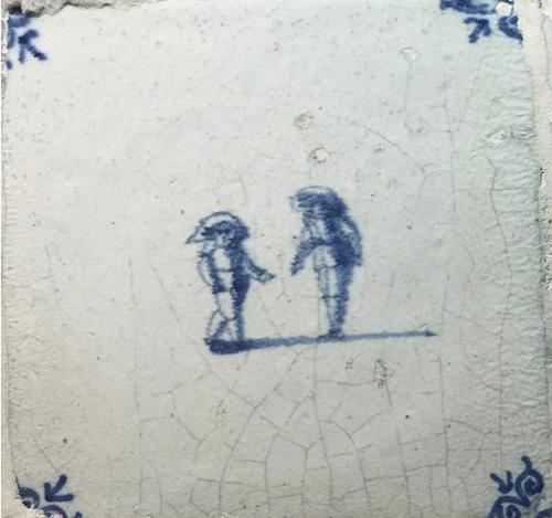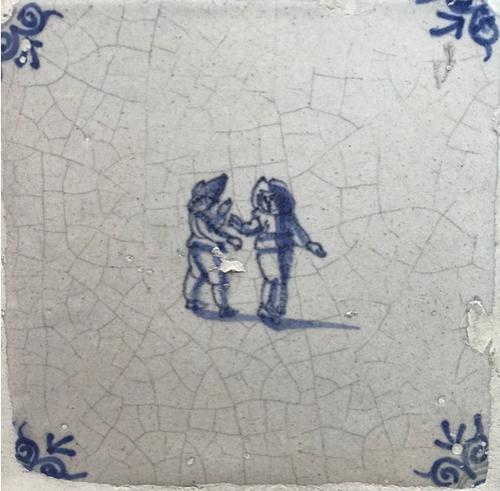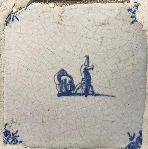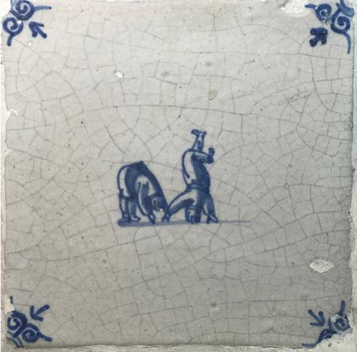Tegel van aardewerk met tinglazuur voorstellende klo...