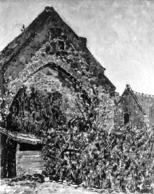 Een oude schuur onder geboomte