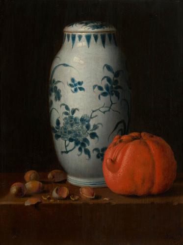 Stilleven met Chinese dekselpot, hazelnoten en sinaa...