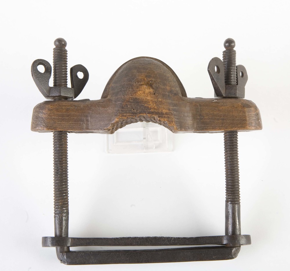 Katrol van hout en ijzer, aan de ring een korte kett...