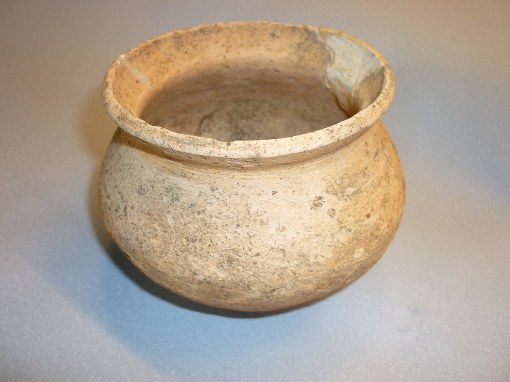 Pot van aardewerk, bolvormig met opstaande rand, mid...