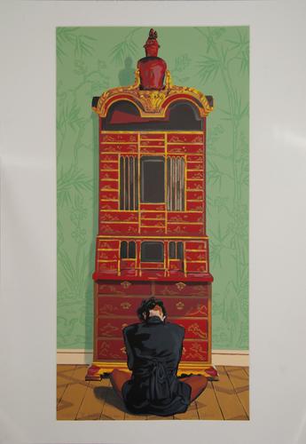 Vrouw zittend voor een kabinet