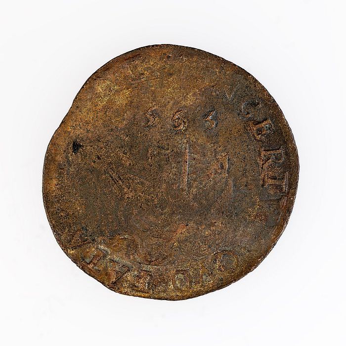 Rekenpenning uit "1565" met schip en vrouw met anker