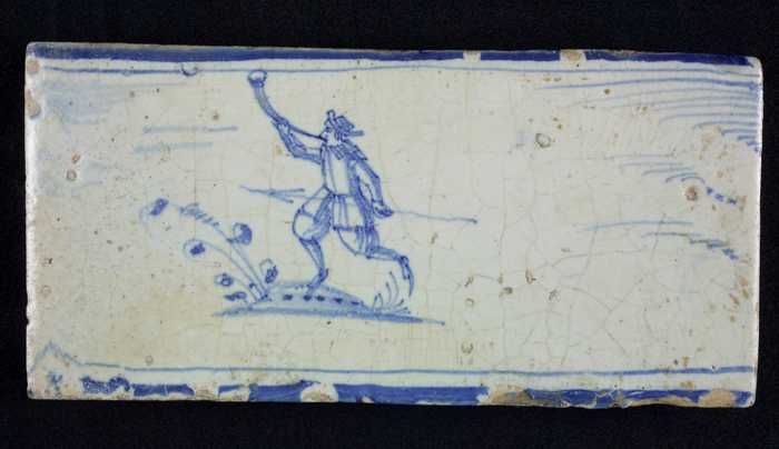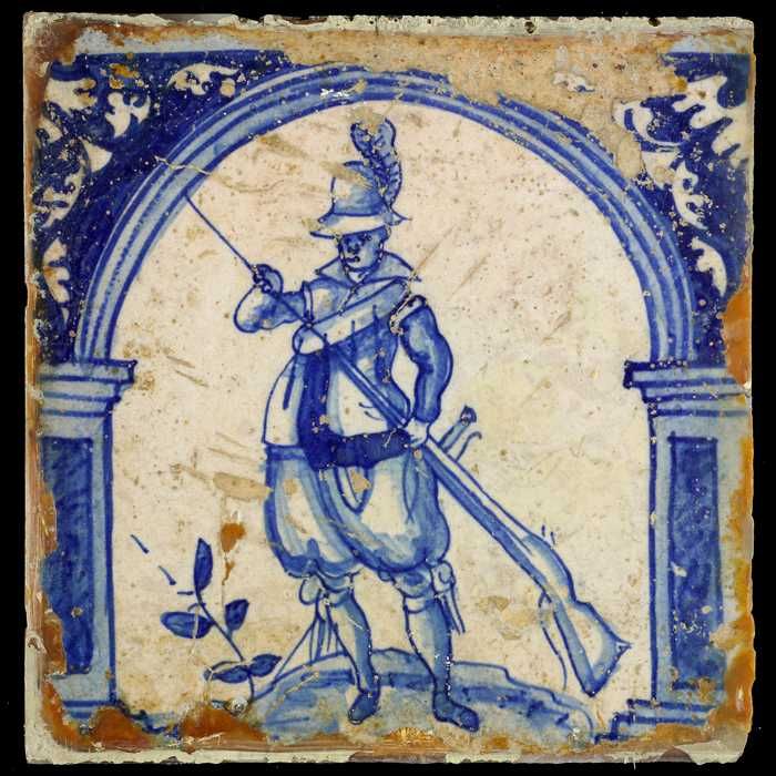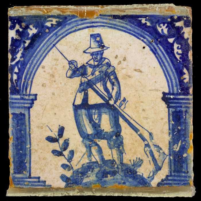 Figuurtegel, in blauw op wit, krijgsman met geweer