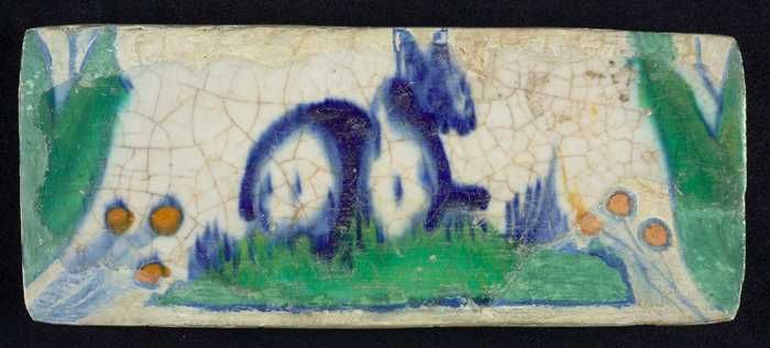 Randtegel, blauw, geel en groen, liggend dier, haas?