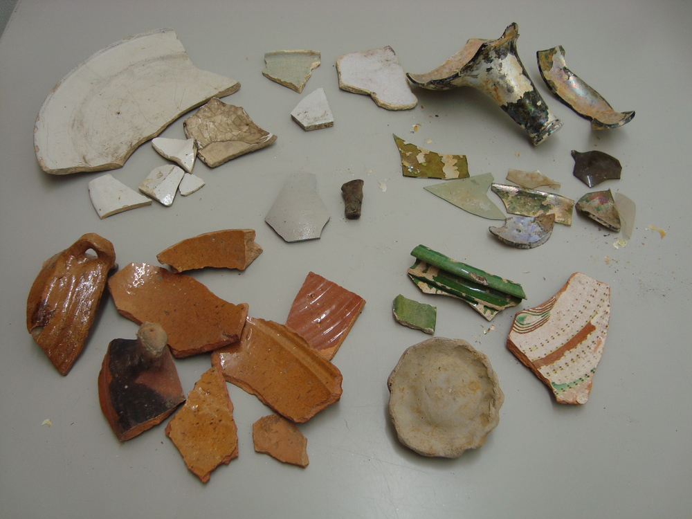 Fragmenten, glas/steengoed/delfts wit/majolica/aarde...