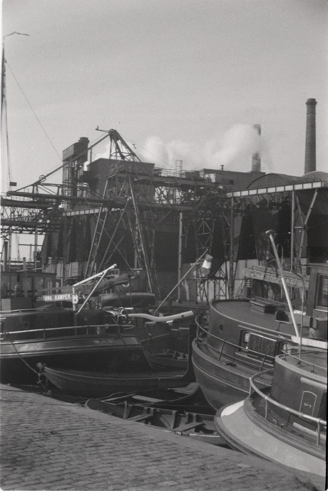 Binnenvaarders liggen in een haven bij het Gemeentel...
