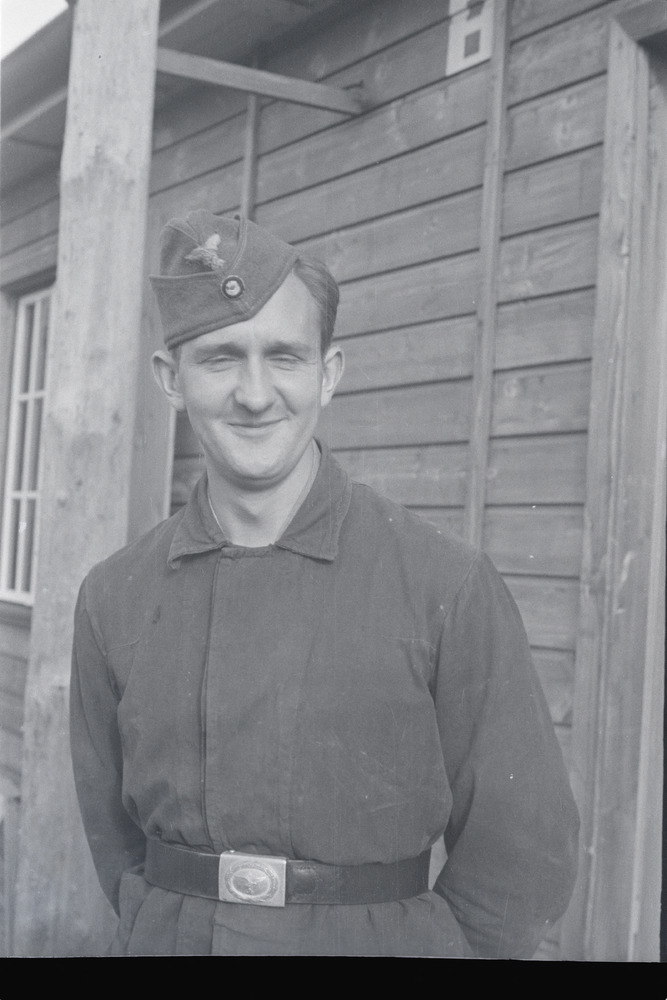Lachende Duitse militair staat voor een barak.