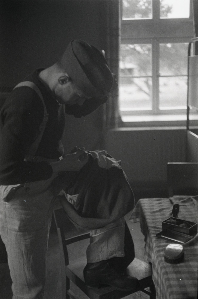 Een Duitse militair repareert zijn kleding.
