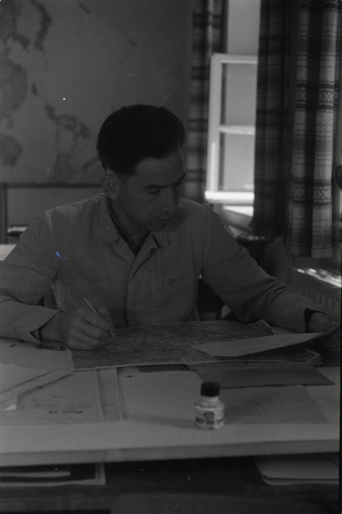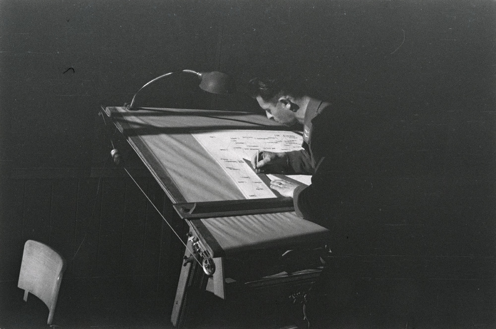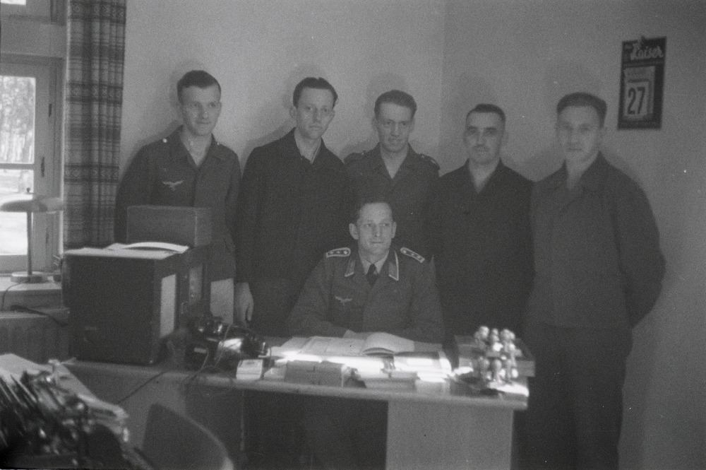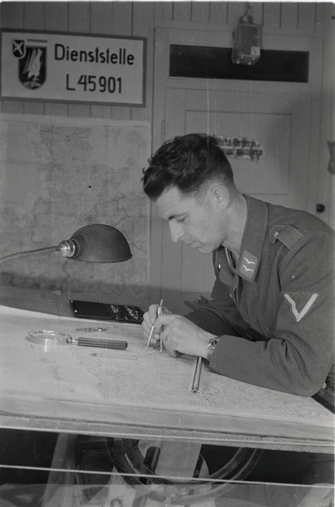 Een Luftwaffe Gefreiter werkt achter een tekentafel ...