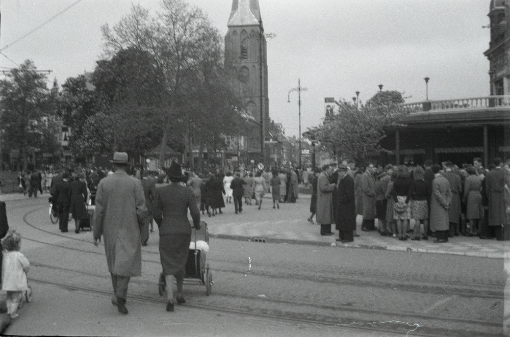 Drukte op het Velperplein in Arnhem. Rechts Musis Sa...