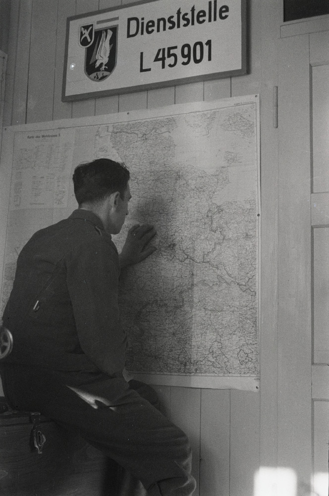 Een Luftwaffe Gefreiter is aan het werk op een landk...