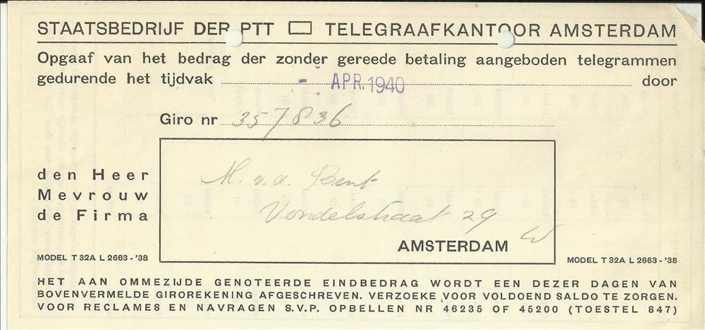 Staatsbedrijf der PTT telegraafkantoor Amsterdam voo...