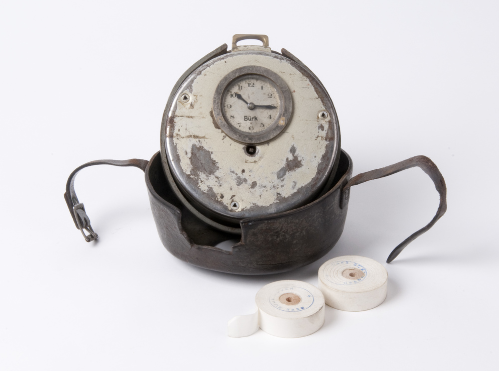 Nachtwakersklok van metaal met lederen foudraal, ver...