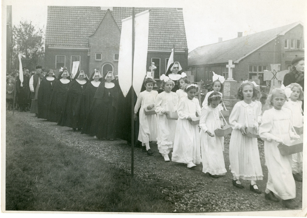 Zwart-wit foto van een processie in Pannerden in 1950