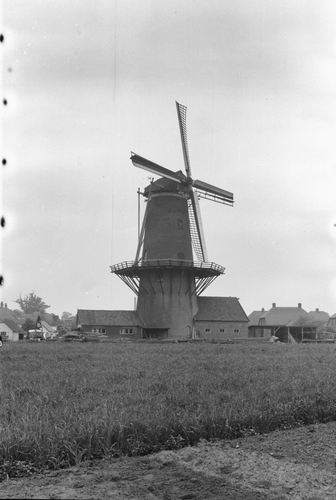 Ronde stenen stellingmolen schuin van opzij gefotogr...