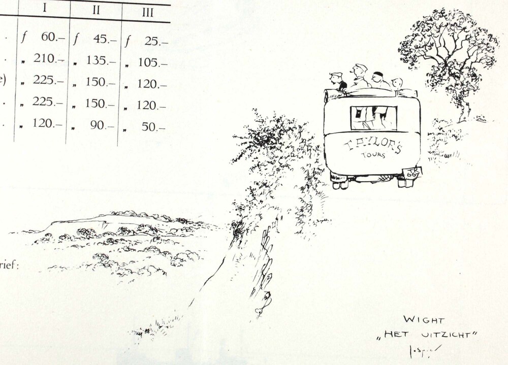 Illustratie door Jo Spier van een touringcar aan de ...