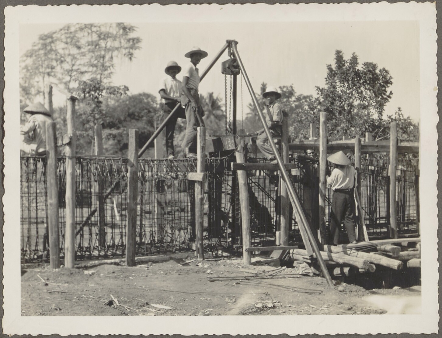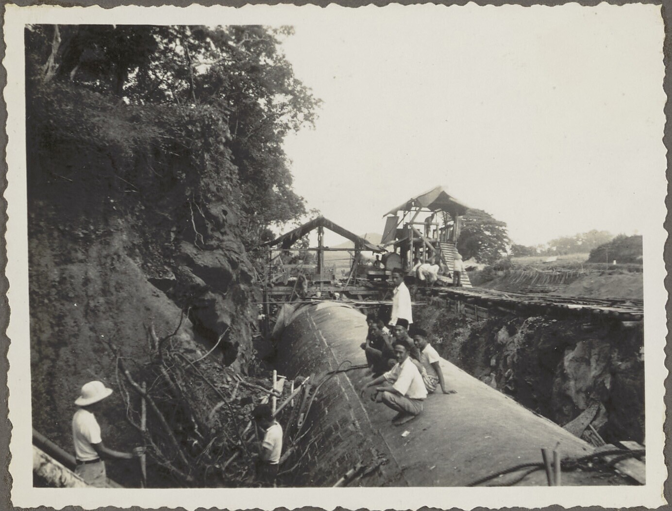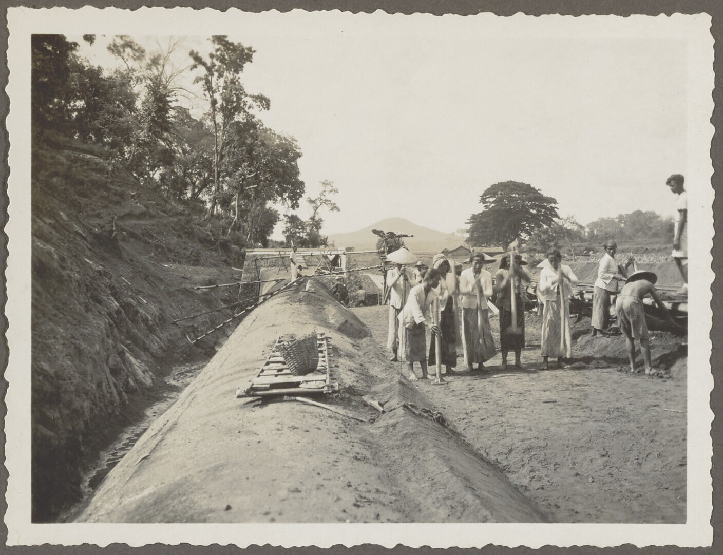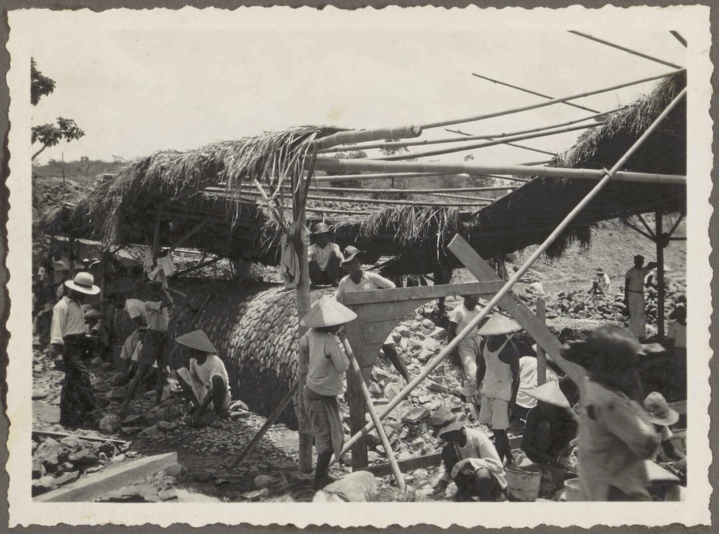 Bouw van een buis met woelbak door Javaanse arbeiders