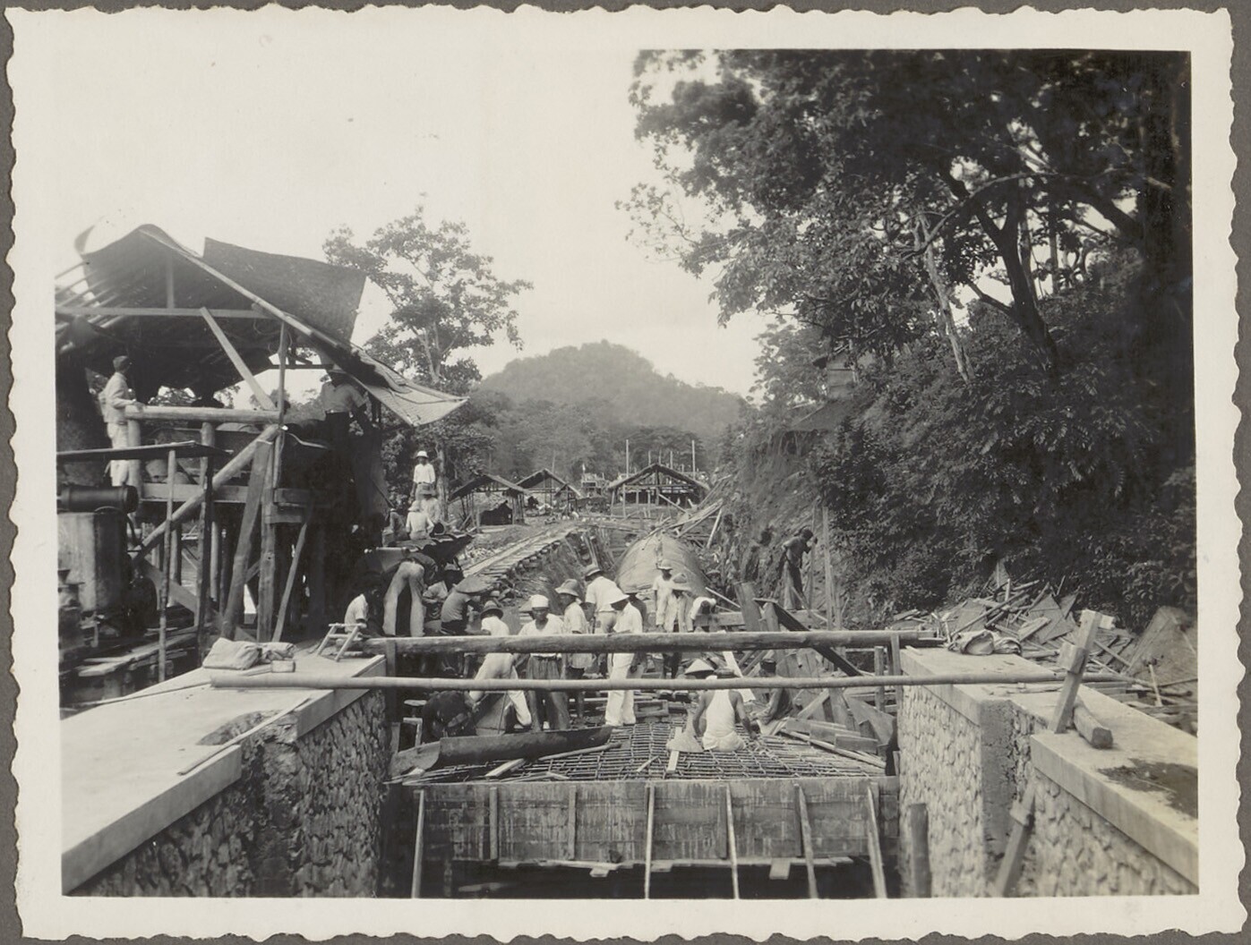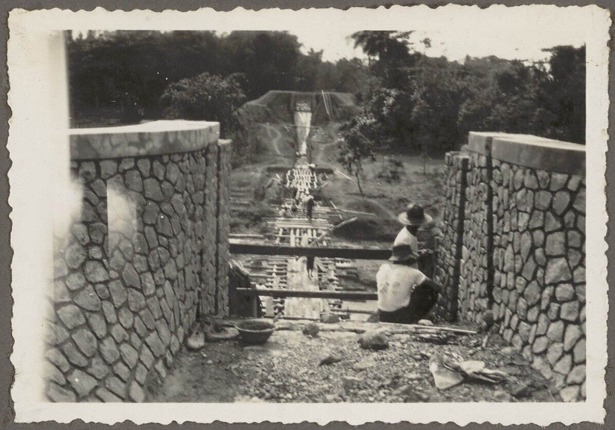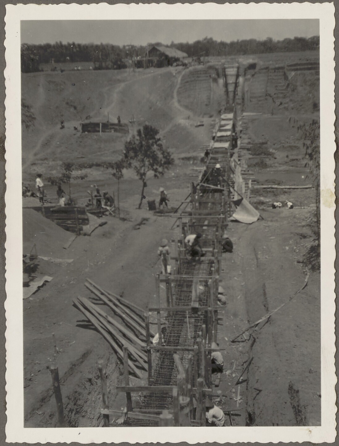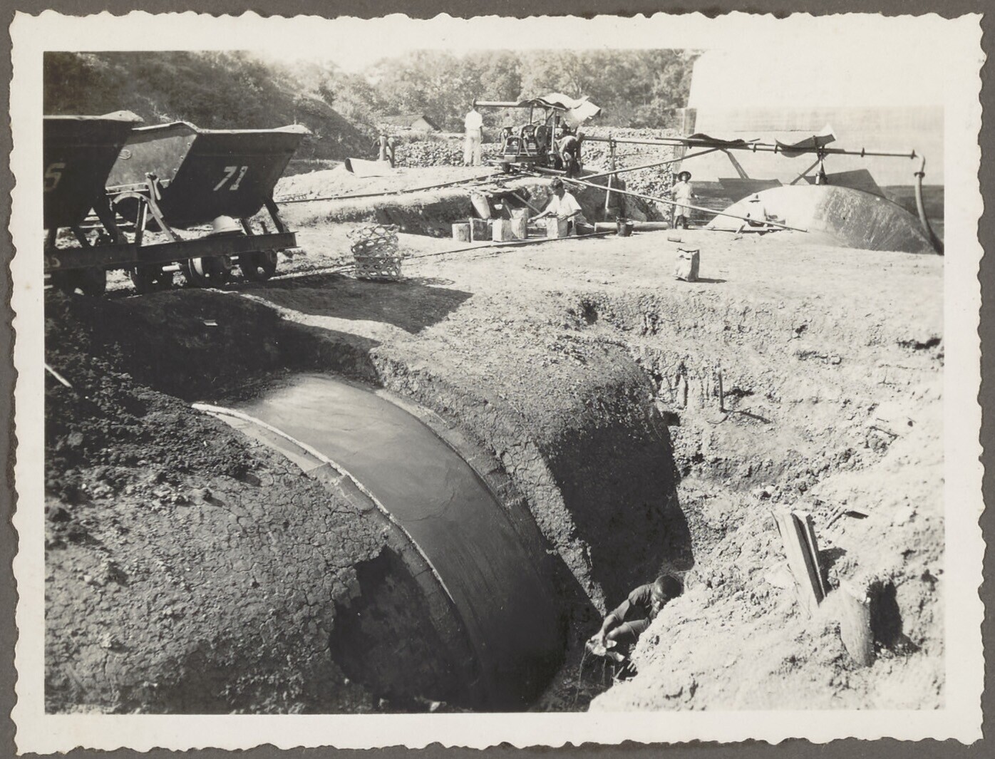 Bouw van een buis met woelbak door Javaanse arbeiders