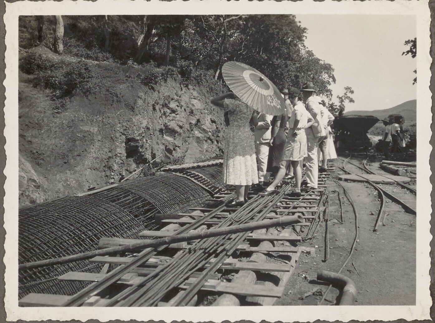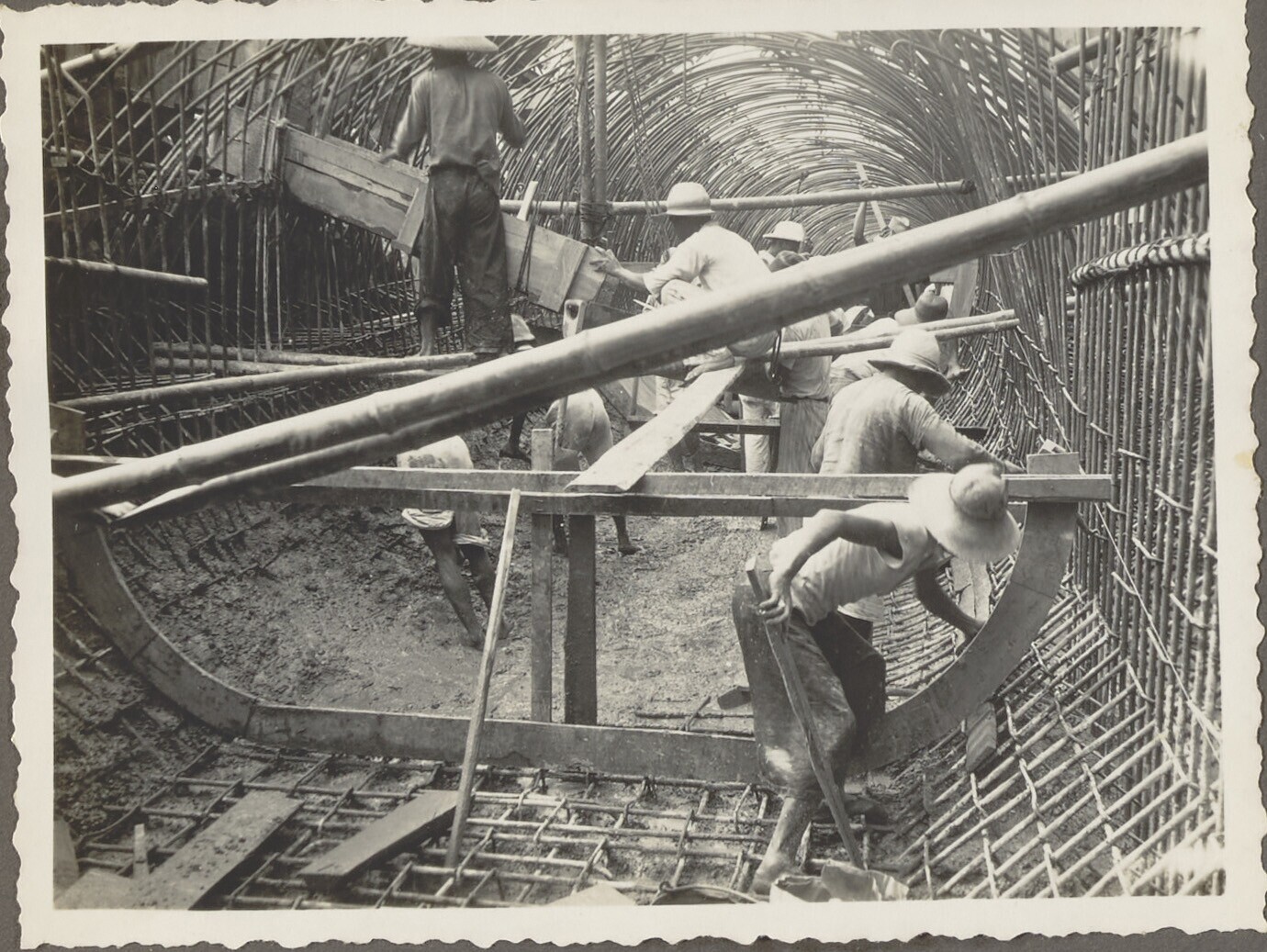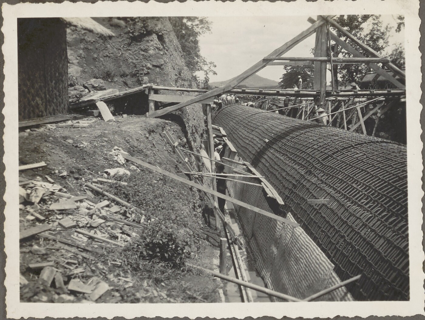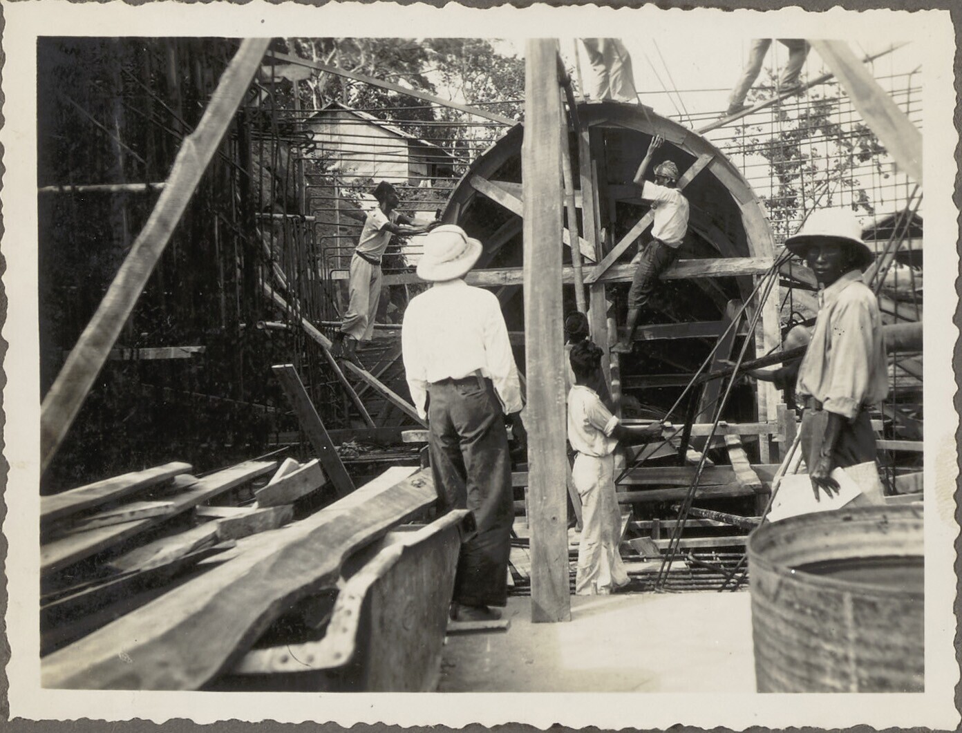 Bouw van een buis met woelbak door Javaanse arbeiders